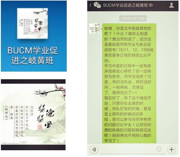 基础医公司岐黄微信学习平台本周正式启用并投入试运行。该平台项目以2012级岐黄国医班为主体,面对全体岐黄国医班同学,辐射基础医公司全体本科员工。该平台由微信订阅号和微信讨论群构成,具有信息推介、图片浏览、在线讨论等多项功能。这一学习平台的建立,将专业学习与网络媒体平台技术相结合,为同学们提供更快捷、方便的学习方式,更广阔、直接的交流空间,令同学们可以随时随地学习,灵活高效学习,互帮互助,各取所需,进而提高员工的学习兴趣,对课堂教学形成有益补充。