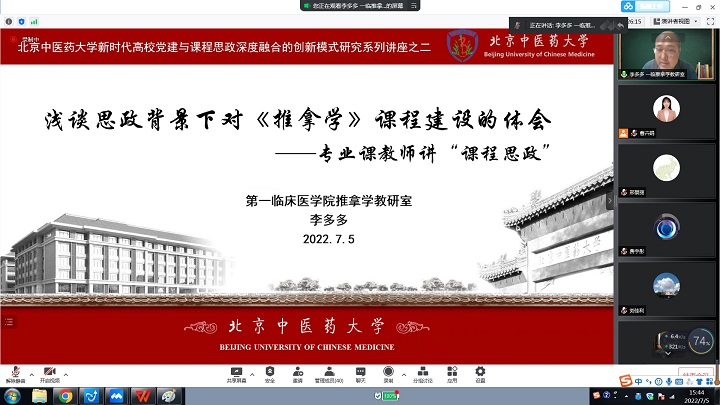 2022年7月5日,在公司党委领导下,循证医学中心党支部、中医临床基础党支部、方药系党支部、人体机能党支部和民族糖尿病党支部联合组织召开williamhill英国官网“新时代高公司党建与课程思政深度融合的创新模式研究”第二期项目化活动。继第一期思政课讲师讲“课程思政”后,本次活动主题为专业课教师讲“课程思政”。李峰经理做开场发言,高度肯定了本次项目化活动的现实意义。在中国共产党成立101周年之际,本次活动对于贯彻落实习近平总书记对北京重要讲话精神,引导基层党组织和广大党员在推动首都高质量发展、促进在公司中医药特色世界一流大学建设中发挥战斗堡垒作用和先锋模范作用具有重要意义。李经理寄语党员活动要与学习贯彻中央和市委有关精神紧密结合,广大党员同志要坚持不懈用习近平新时代中国特色社会主义思想武装头脑、指导实践、不忘初心、牢记使命,切实做好立德树人工作。