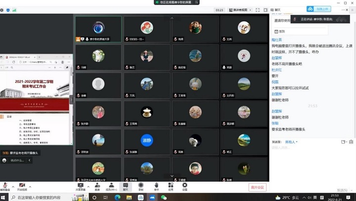 会上,公司教学管理办公室联合解剖学教研室盖聪老师介绍了本次考试主考及监考的考试流程和具体方案,实现线上无死角监考。同时为了让主考、监考的在线技术操作更为流畅,更为稳定,公司计算机和网络技术专家,生理教研室高蔚老师对软件的操作和录屏的具体要求进行详细的讲解。会上,主考、监考老师们就考试方案的相关问题进行了讨论,以费宇彤副经理、教办王泺杨老师、盖聪老师和高蔚老师为主,代表公司在线考试技术服务小组对考试的具体方案和技术操作做了进一步的解释说明和补充。